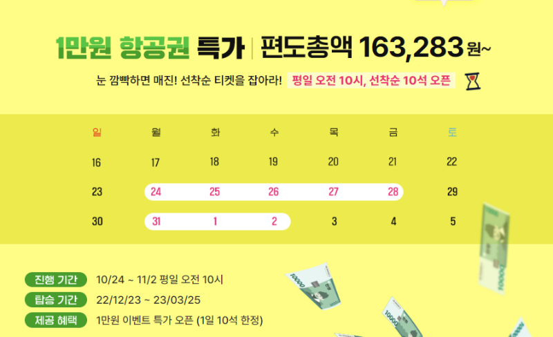 1만원이라는 건 마케팅일뿐... 1만원 항공권이라고는 보기 어렵고, 인천->시드니 편도에만 해당하며, 선착순 10명안에 들기도 쉽지 않을 것이 예상된다. 그럼에도 편도를 16만원에 잡는다면 요즘같은 시기에는 대성공! 이밖에도 이벤트 기간 특가 좌석, 유류할증료 할인, 중복할인 이벤트도 함께 제공한다.